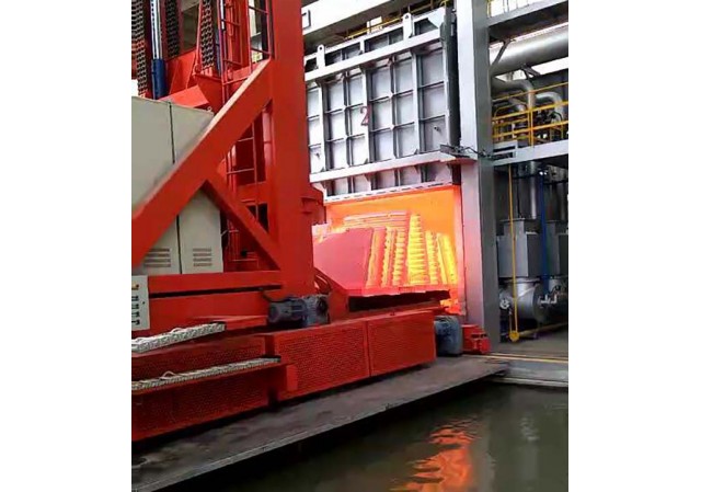 生產(chǎn)線配有一臺快速下水(油)淬火操作車,該操作車可上下、左右、前后六個方向移動。工件熱處理完成后,操作車迅速進(jìn)入爐內(nèi)將工件從爐膛內(nèi)叉出,并快速落入水池或淬火液池內(nèi),整個轉(zhuǎn)移過程可控制在30秒內(nèi)完成。
