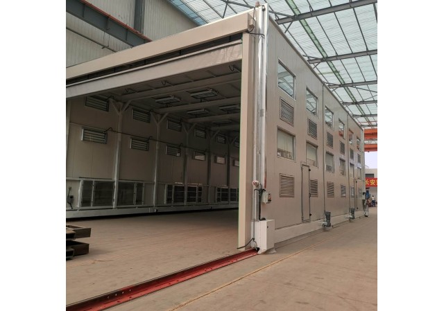 龍門移動式噴漆間是本公司為解決重型工件移動困難及工作區(qū)可連續(xù)交叉作業(yè)的綜合利用而專門設(shè)計的實用性產(chǎn)品。解決了一般固定式噴漆間重型工件移入移出繁瑣的工序。工件噴漆前首先通過啟動預(yù)定程序?qū)⒎矿w移動至噴漆場地,罩住工件后即可進(jìn)行噴漆作業(yè),如此設(shè)計可以實現(xiàn)大型工件的不間斷連續(xù)噴漆工作。