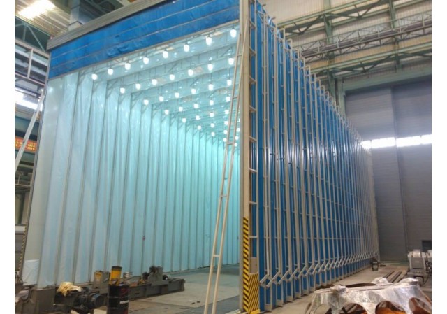 伸縮移動(dòng)噴漆間前室為鋼結(jié)構(gòu)框架,可縱向自由伸縮移動(dòng)。噴漆時(shí),先將前室合攏,將大型工件或重量較大工件吊至噴漆位,再將前室打開,進(jìn)行噴漆作業(yè)。此外,在不噴漆的工作時(shí)間內(nèi),可將前室合攏,騰出空間為其他可與噴漆交叉作業(yè)的工序使用。